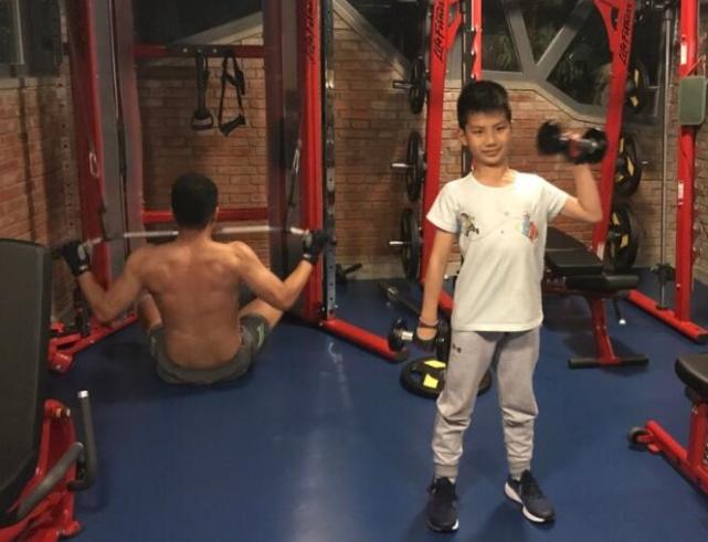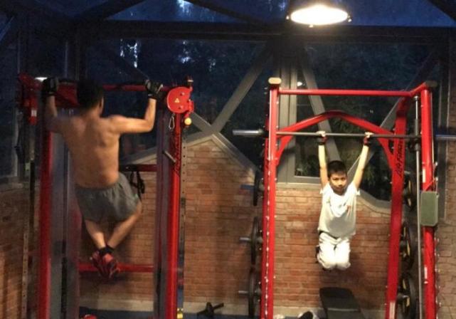 胡军肌肉抢镜,儿子康康则玩着哑铃