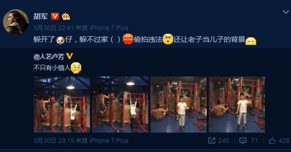 胡军转发妻子的微博,无奈称:“躲开了狗仔,躲不过家人,偷拍违法,还让老子当儿子的背景!”网友则调侃:“胡军老师背部肌肉抢镜。”“然而事实是作为背景的您抢了儿子的风头。”