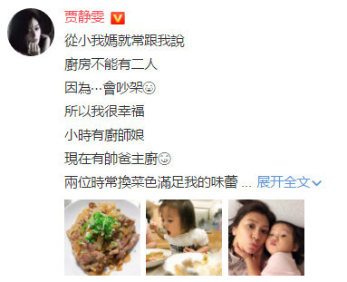 贾静雯29日在脸书上发文,先是写道,“从小我妈就常跟我说,厨房不能有二人,因为…会吵架,所以我很幸福,小时有厨师娘,现在有帅爸主厨,两位时常换菜色满足我的味蕾。”