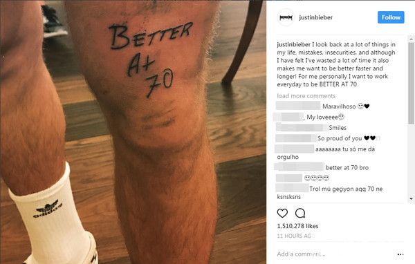 贾斯汀-比伯16日在IG上与粉丝分享自己的大腿的新刺青,该刺青写着“Better at 70(70岁要变得更好)”他在发文中解释刺青的含意,“我回看生命中的许多事情,那些犯过的错误,没有安全感的时刻,虽然我觉得已经浪费了很多时间,但是这些也让我意识到我需要用更快的速度,变得更好,而且要维持很久!对我来说我每天都要很努力,才能在70岁的时候变得更好。”