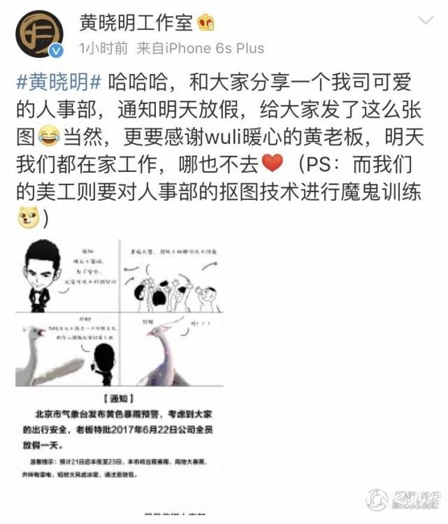 腾讯娱乐讯 据气象局预告:北京预计6月22日将迎来大暴雨。极端天气势必会给很多人的出行路带来不便,但黄晓明公司的员工不用担心这个问题了。曾经给员工放假躲大风的中国好老板黄晓明又上线!6月21日晚,其工作室微博发布了一份黄晓明公司人事部的放假通知,用四格漫画的形式俏皮表示考虑到大家的出行安全,黄老板特批6月22日全员放假一天。有趣的是,黄晓明主演的新剧《上古情歌》中的“网红”琅鸟烈阳也傲娇出镜。网友纷纷羡慕并点赞“好暖心的黄老板”,“这样的好老板像熊猫一样,需要保护。”