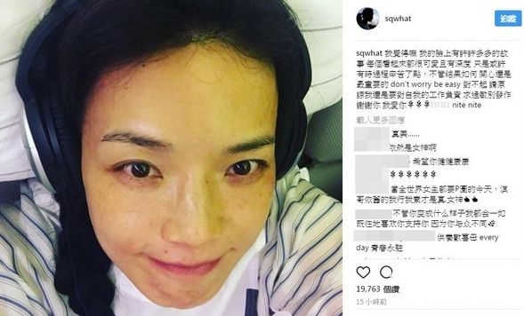 舒淇露出全素颜的脸蛋自拍,因为过敏导致脸上出现红色斑点,如今已经消去了不少,抿嘴微笑的照片,透露逐渐好转的心情。她的素颜照被网友称赞“当全世界女生都要P图的今天,淇哥依旧的我行我素才是真女神”、“依然是女神”、“岁月给你留下的,就是最好的”,还得到许多网友提供治疗经验,率直作风吸引大批粉丝支持“这样才真实!”