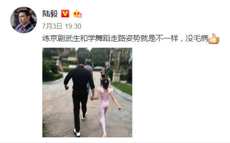 腾讯娱乐讯 7月3日晚,陆毅晒出一张送女儿贝儿上芭蕾班的照片,并称:“练京剧武生和学舞蹈走路姿势就是不一样,没毛病。”
