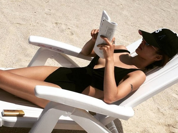 照片中,蔡依林穿着全黑的连身泳衣,不只领口深V几乎开到肚子,连腰侧都有大面积挖空的设计,十分火辣。她戴着棒球帽,优雅地躺在海滩椅上看书,PO照同时还写下“Sunbathing~~”,展现悠闲感。