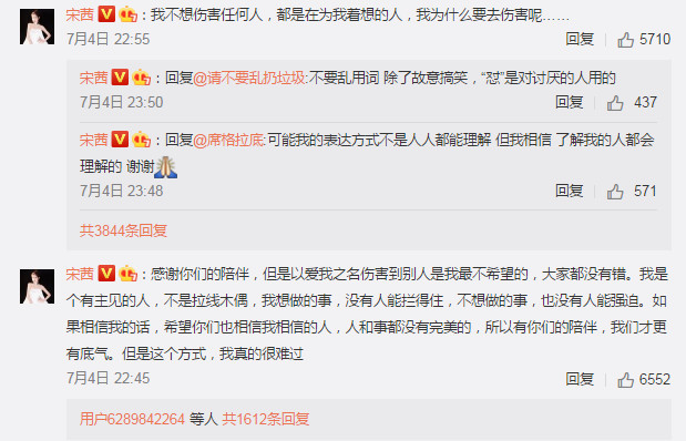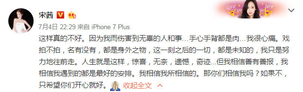7月4日晚,宋茜通过微博对竟然粉丝手撕经纪人作出回应,称:“这样真的不好。因为我而伤害到无辜的人和事…手心手背都是肉…我很心痛。戏拍不拍,名有没有,都是身外之物,这一刻之后的一切,都是未知的,我只是努力地往前走。人生就是这样,惊喜,无奈,遗憾,奇迹。。。但我相信善有善报,我相信我遇到的都是最好的安排。我相信我所相信的。那你们相信我吗?如果不,只希望你们开心就好。”