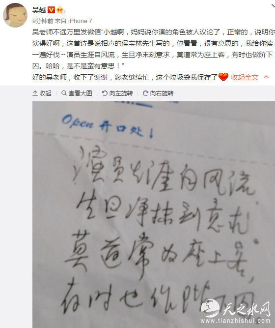吴越称自己随手写在了垃圾袋上,回应“好的吴老师,收下了谢谢,您老继续忙,这个垃圾袋我保存了”。也首度表明了自己的态度,心态很坦然。