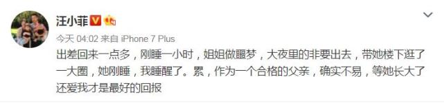 汪小菲发文写道“出差回来一点多,刚睡一小时,姐姐做噩梦,大夜里的非要出去,带她楼下逛了一大圈,她刚睡,我睡醒了。累,作为一个合格的父亲,确实不易,等她长大了还爱我才是最好的回报。”