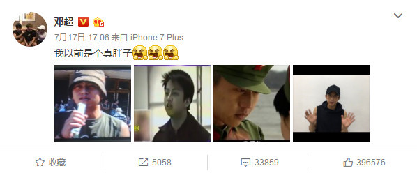 腾讯娱乐讯 7月17日消息,据台湾《东森新闻》报道,邓超个性幽默,经常都会在微博上与粉丝分享生活日常点滴,吸引不少网友关注。他17日分享了数张自己过去的旧照,当时他似乎尚未减肥成功,两颊明显略宽,肉嘟嘟的脸蛋,几乎快占满电视荧幕,让他看了也忍不住自嘲是“真胖子”。
