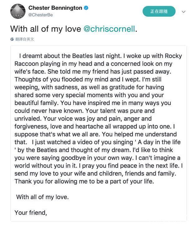查斯特轻生这天正巧是已故好友声音花园的主唱Chris Cornell的生日。查斯特·贝宁顿和52岁的Chris Cornell的交情非常好,5月18日挚友在酒店上吊轻生,查斯特曾在推特发文悼念:“你有很多部分激发了我的灵感,我没有办法想像这个世界没有你,祈求你在下一个人生得到安宁……”