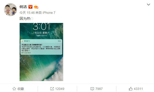腾讯娱乐讯 7月22日,何洁在微博上晒出一张手机截图,并发文:“因为热”。