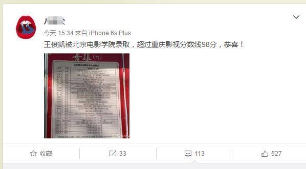 7月19日,微博网友发布了一张疑似王俊凯所在高中——重庆八中发布的2017级艺术生高考喜报。并配文:“王俊凯被北京电影学院录取,超过重庆影视分数线98分,恭喜! ”。据喜报上登载,王俊凯以文科裸分438分的文化课成绩考入北京电影学院,并超过重庆市表演(影视)本科线98分。