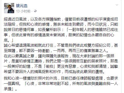 在此以最真诚之意,谨向媒体先进报告,现在大家讨论的那一张照片,是当初感情正浓时,我们之间一张很亲密互动的居家照片,那是一段美好的记忆,不是“偷拍”更没有恶意,心凌和我都清楚,诚挚希望不要因外人的捕风捉影和炒作,而成为彼此最深的遗憾。
