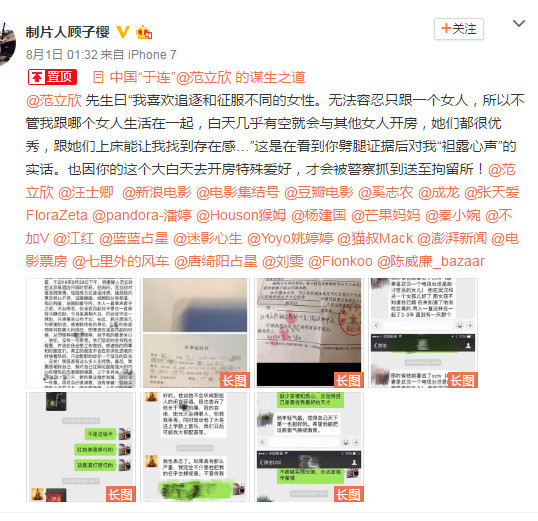 昨日凌晨,制片人顾子樱(微博认证为“北京金色池塘传媒股份有限公司副总裁”)发表博文《中国“于连”@范立欣 的谋生之道》,并配上了相关微信截图和拘留证照片。在文中,顾子樱怒斥导演范立欣多次欺骗女性感情,在交往中索要对方钱财还屡屡劈腿,并在分手之际用短信、微博恶意骚扰对方。女方报警之后,警察将正在酒店开房的范立欣抓获,判处拘留五天。