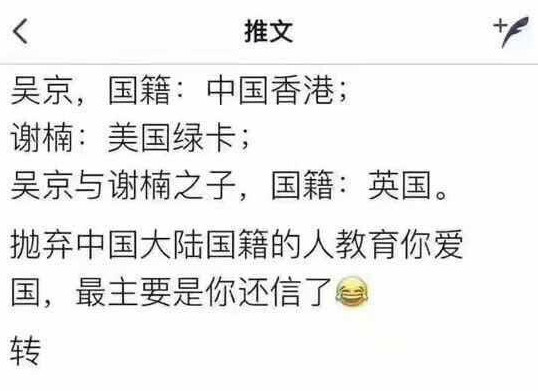近日,有网友爆料称,吴京是香港籍,谢楠是美国绿卡,而孩子吴所谓在英国出生,是英国籍。有记者联系了谢楠妈妈,谢楠妈妈回应:吴京和谢楠、吴所谓都是中国国籍。这点从吴京、谢楠的护照、以及吴所谓的出生证明均可以得到证实。