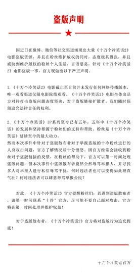该申明中表示,近期网上涌现出大量《十万个冷笑话2》的电影盗版资源,在粉丝进行举报维权后,盗版链接扩散者不仅辱骂粉丝,并寻找多人进行私信辱骂干扰,行为极其恶劣。并表示电影《十万个冷笑话2》未发行任何网络传播版本,目前除电影院外没有其他观看渠道,对于盗版链接扩散者,官方将随时保留追究法律责任的权利。该申明还表示,粉丝是“十冷”坚持和发展的动力,看到粉丝被辱骂,干扰,整个团队及出品方都非常愤怒,提醒粉丝如遇盗版散布者第一时间联系“十冷”官方,不要自己面对攻击。在申明中官方也表示,希望大家对打击盗版问题给予重视,尊重每一个幕后人员的付出,为国产动画的发展保留空间。