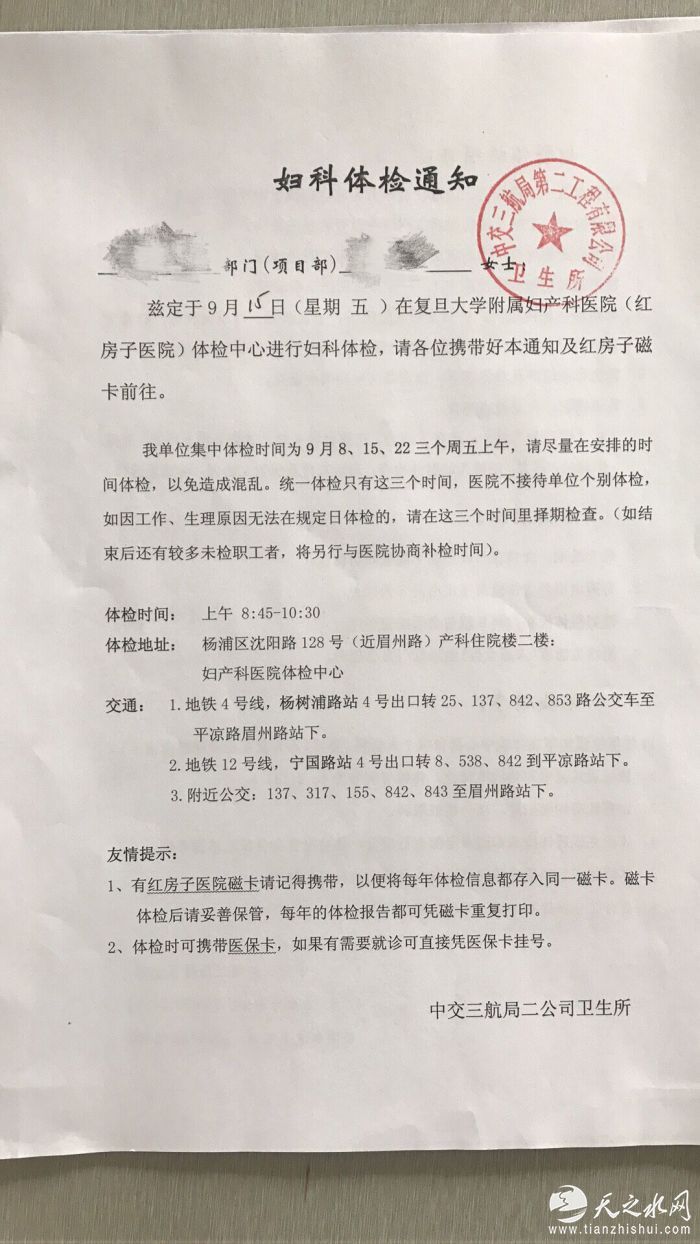 图为中交三航二公司妇科体检通知单