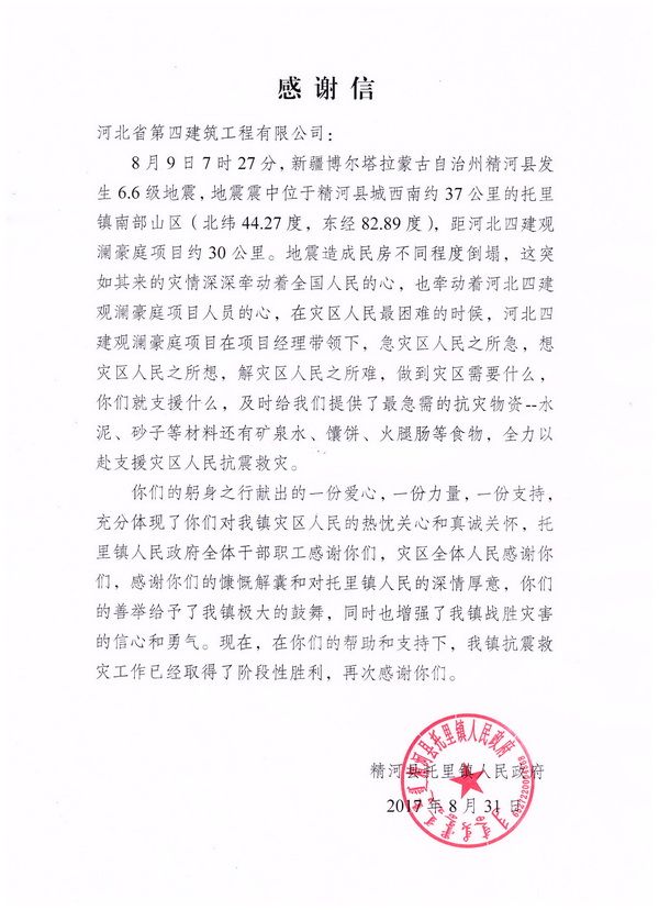 河北建工集团省四建公司收到新疆地震灾区表扬信