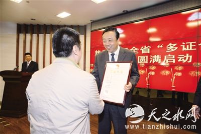 中国甘肃网9月27日讯 据西部商报报道 (记者 张云) 9月26日,甘肃省暨兰州市“多证合一”改革启动仪式在兰州举行。在启动仪式现场,副省长、省政协副主席郝远向取得甘肃省首张“多证合一”营业执照的甘肃金凤凰教育咨询有限公司企业法人颁发了营业执照。省工商局局长王世华、兰州市副市长吴险峰分别为兰州住商东升房地产经纪有限公司、甘肃银海汇工贸有限公司颁发了“多证合一”营业执照。
