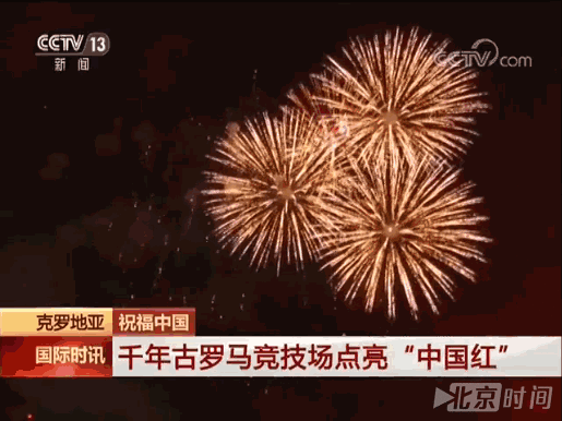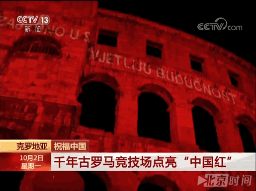 为了庆祝中国国庆和中克建交25周年,欧洲国家克罗地亚海滨城市普拉的一座古罗马竞技场进行了一场点亮中国红的活动。