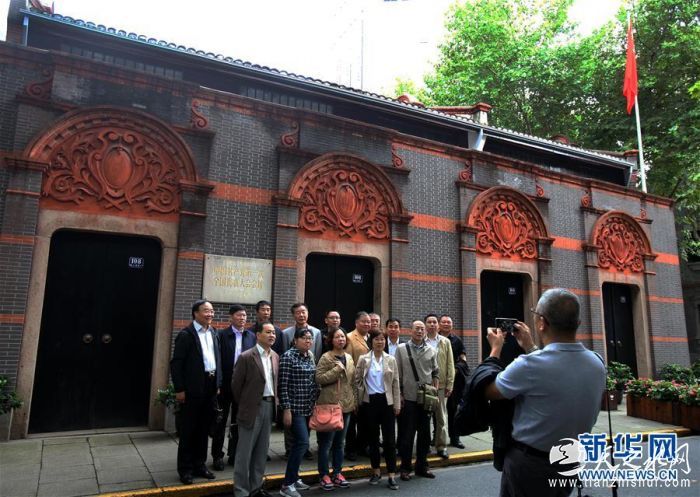 参观者在位于上海市兴业路的中共一大会址纪念馆前合影留念(10月18日摄)。