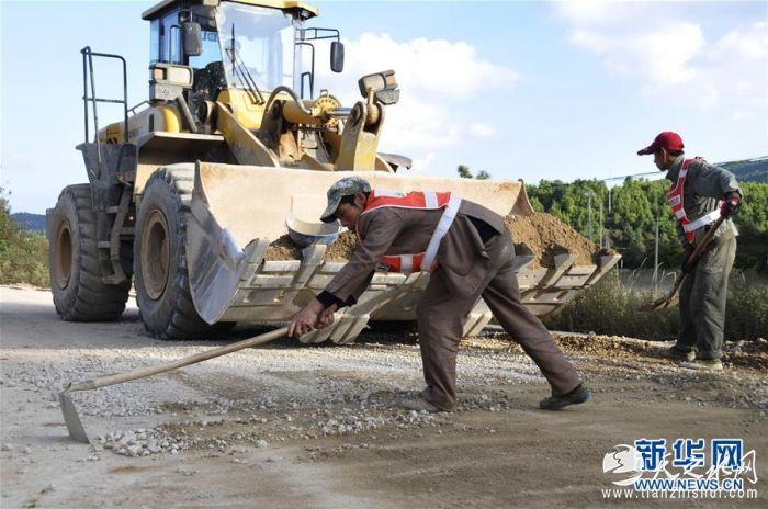 工人在云南省会泽县驾车乡的乡村公路施工现场忙碌(10月20日摄)。