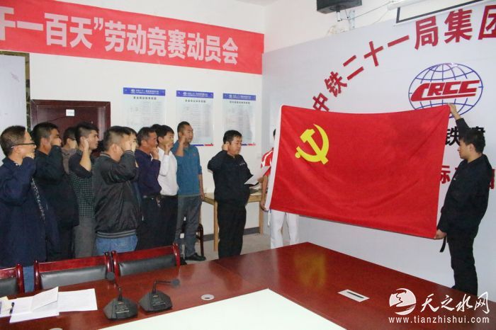 (记者 常魁星 通讯员 王江辉 王孚)“我志愿加入中国共产党,拥护党的纲领……。”11月13日,中铁二十一局兴泉铁路XQXN-4标一分部党支部召开学习领会十九大精神专题会,党员不忘初心,聚在党旗下高举右手,重温入党誓词。