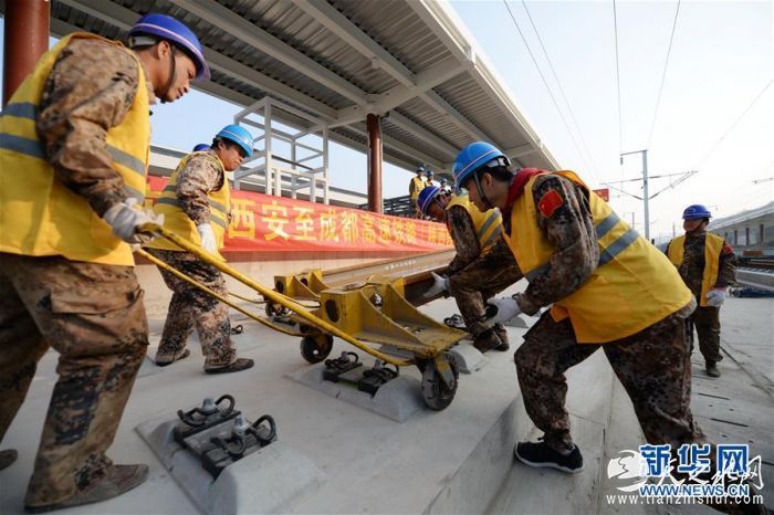 施工人员在西成高铁陕西段宁强南站进行铺轨作业(2月28日摄)。新华社记者 李一博 摄