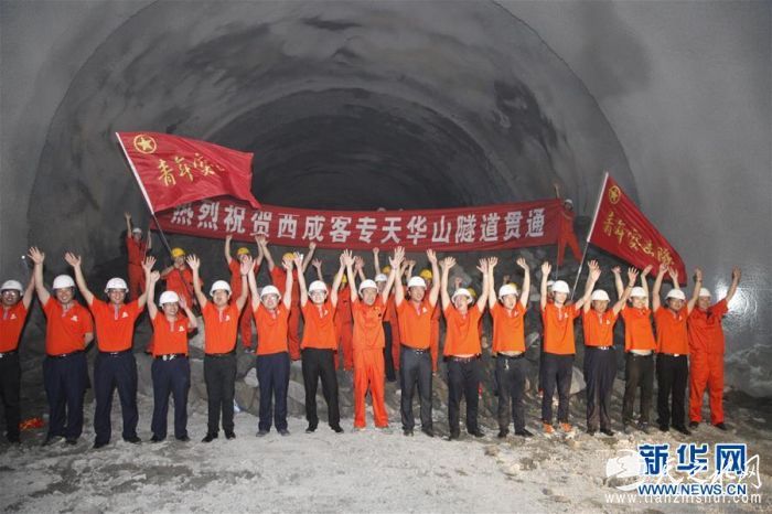 西成高铁天华山隧道施工人员庆祝隧道贯通(2016年7月8日摄)。新华社发