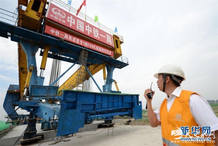 中铁一局的工作人员在施工现场指挥箱梁架设(2016年5月30日摄)。新华社记者 李一博 摄