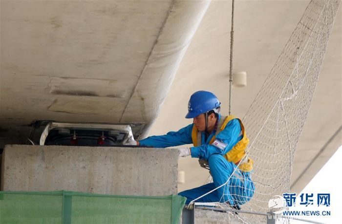 中铁一局的施工人员在西成高铁沣河特大桥上进行箱梁架设施工(2016年5月30日摄)。新华社记者 李一博 摄