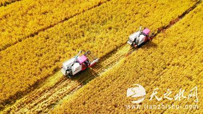日前,福建省上杭县中都镇军联村聚胜家庭农场,李兵(左车)和同乡李强开着收割机收割晚稻。新华社发