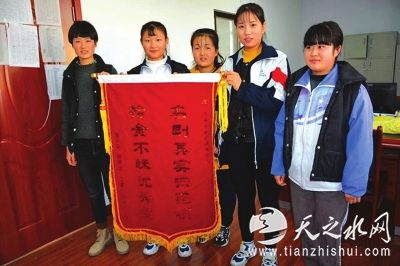12月4日,为了表达对几名学生的感谢之情,胡先生专门制作了一面“名副其实示范校拾金不昧优秀生”的锦旗送到天水市职业技术学校。学校也为此授予5名学生“拾金不昧品德高尚优秀学生”的荣誉称号。