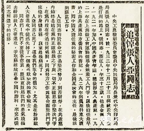 1933年1月7日《红色中华》报刊发《追悼张人亚同志》,图片来自党建网