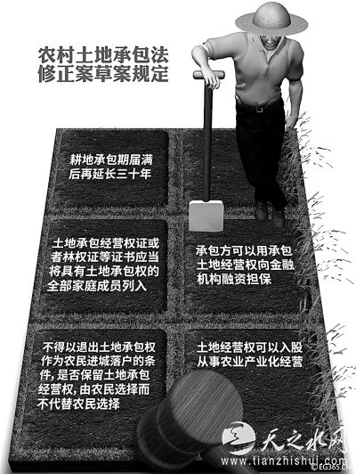 农村土地承包法修正案草案此次明确规定:国家依法保护农村土地承包关系稳定并长久不变。为了给予农民稳定的土地承包经营预期,草案还规定,耕地承包期届满后再延长30年。这也标志着十九大报告中对广大农民的庄严承诺将被体现在法律条文中。