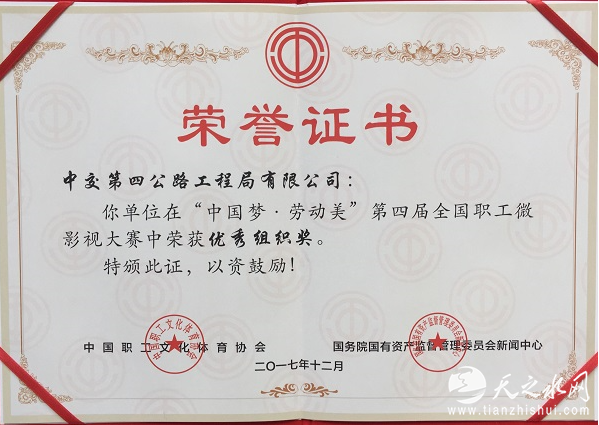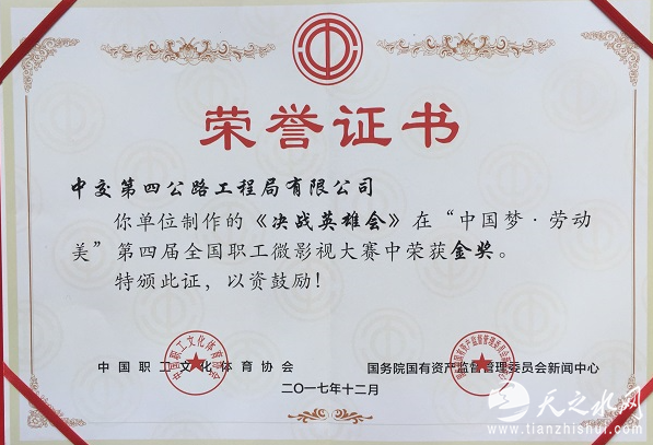 (记者 常魁星 通讯员 王卓千)12月21日,中交第四公路工程局有限公司获得第四届“中国梦·劳动美”全国职工微影视大赛优秀组织奖、微电影《决战英雄会》金奖、《蓝》铜奖证书。