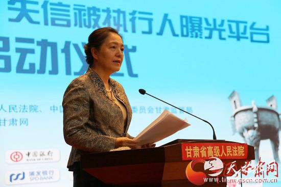 陈青代表甘肃省委,省委宣传部向平台的上线表示热烈祝贺。她说,创建完善失信被执行人曝光平台、强化失信惩戒是坚持法治思维运用法治方式推进诚信建设、培育践行社会主义核心价值观的重要举措,是推进解决执行难的创新方法,是推进银行业金融机构加强风险管控的重要手段。甘肃“鼎立信”失信被执行人曝光台的建设,正是人民法院、新闻媒体、金融单位落实中央和省委精神的具体体现,也是实施“互联网+”国家战略加的有力抓手,“互联网+宣传”和“互联网+政务”的有益尝试,该平台将为诚信建设发挥重要的作用。