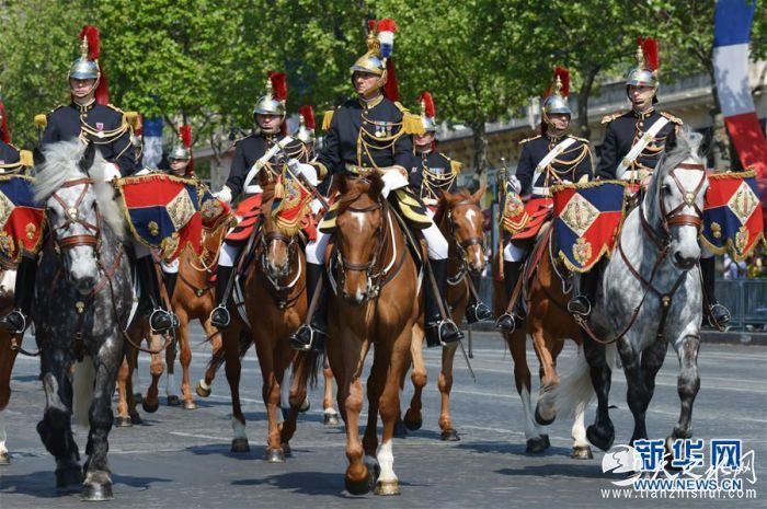 2016年5月8日,法国共和国卫队仪仗队策马行进在巴黎香榭丽舍大街上。当日是第二次世界大战“欧洲胜利日”,法国在巴黎凯旋门举行仪式,纪念二战胜利71周年。新华社记者李根兴摄