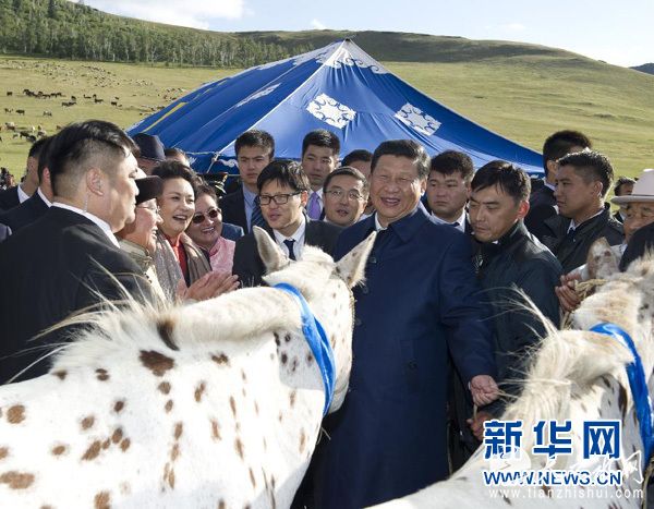 2014年8月22日,国家主席习近平在蒙古国总统额勒贝格道尔吉陪同下前往乌兰巴托市郊观看那达慕。额勒贝格道尔吉向习近平夫妇赠送两匹蒙古马。习近平为两匹马分别取名阿尔泰和克鲁伦,寓意中蒙两国山水相连、睦邻友好。新华社记者黄敬文摄
