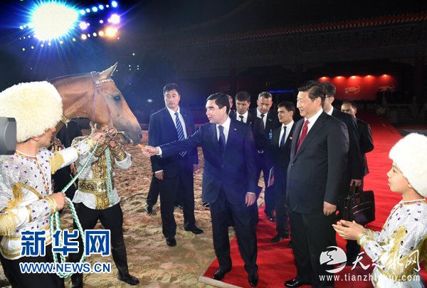 2014年5月12日晚,国家主席习近平与土库曼斯坦总统别尔德穆哈梅多夫在北京共同出席世界汗血马协会特别大会暨中国马文化节开幕式。这是习近平接受别尔德穆哈梅多夫代表土方赠予中方的一匹汗血马。新华社记者刘建生摄
