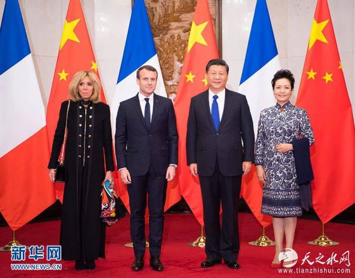 1月8日,国家主席习近平在北京钓鱼台国宾馆会见来华进行国事访问的法国总统马克龙。这是习近平和夫人彭丽媛同马克龙夫妇合影。新华社记者李学仁摄