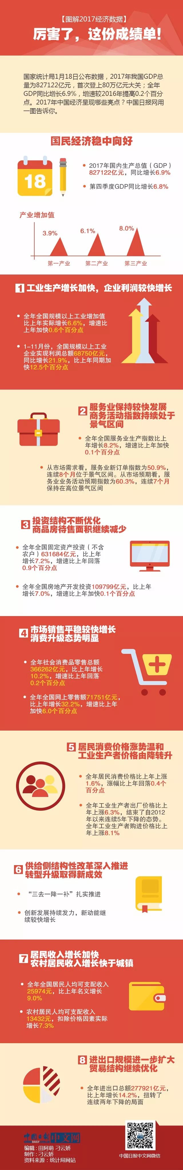 国家统计局1月18日公布数据,2017年我国GDP总量为827122亿元,首次登上80万亿元大关;全年GDP同比增长6.9%,增速较2016年提高0.2个百分点。2017年中国经济呈现哪些亮点?中国日报网用一图告诉你。