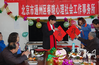 天之水网讯(记者 常魁星 通讯员 张宇涛 段学勇)2018年春节即将到来,1月25日下午,北京市通州区春晓心理社会工作事务所与通州区台湖镇唐大庄村共同举办了“新春送祝福,情暖唐大庄”暖心送福联谊活动。台湖镇唐大庄村活动室里欢声笑语,热闹非常。通州老年书画研究会会长杜德宝、副会长肖萧、书法组长王荣九、通州区春晓心理社会工作事务所10名志愿者、唐大庄村30多位村民参加了联谊活动。