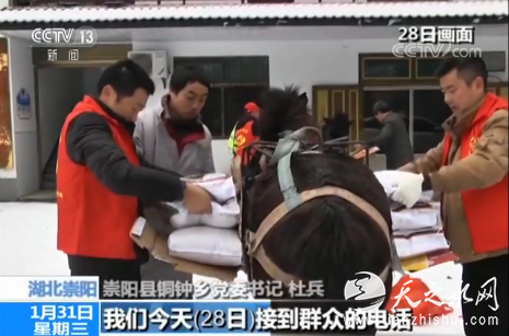 央视网消息:连日来的雨雪冰冻天气,让湖北崇阳大岭村全部被大雪覆盖。车辆无法上山,部分村民断电断粮。近日(28日),当地政府组织30名党员群众组成马帮,徒步五个小时为被困村民们送去了急需的生活物资。