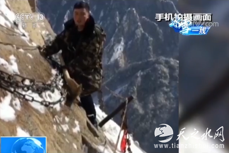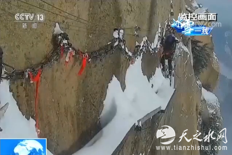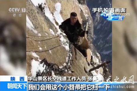 华山景区长空栈道扫雪人张冬冬:我们每次下来,每个人都系好安全绳。我们在这儿时间比较长,所以也熟悉一点儿。系好安全绳,先保证自己的安全。