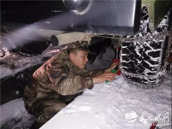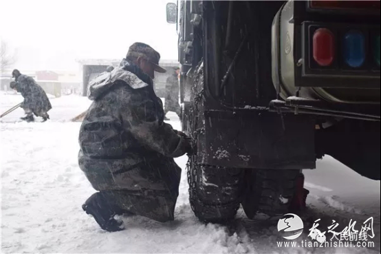 ▲第71集团军某合成旅迅速启动应急方案,检查并禁锢车辆防滑链。