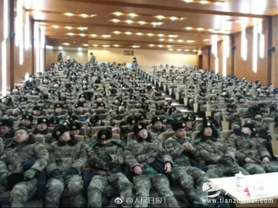 这张照片摄于南京建邺区文化艺术中心小剧场,26日清晨,某舟桥旅官兵540余人,结束彻夜扫雪除冰任务后,在此休息。他们中绝大部分是90后、95后。