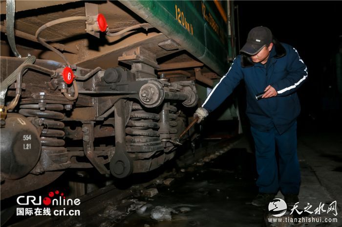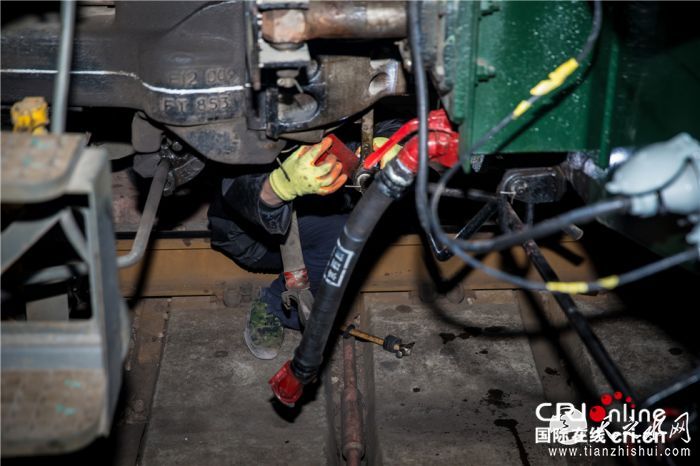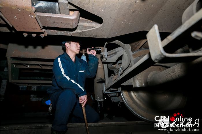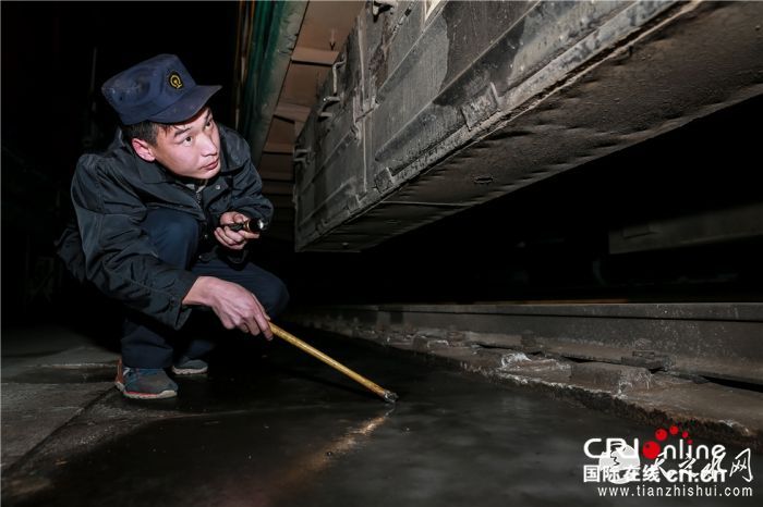 此次列车的值乘人员对列车各部位进行检查确保安全。摄影:沈湜