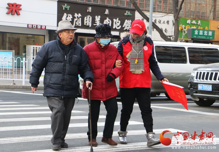 志愿服务队队员帮助老人过马路
