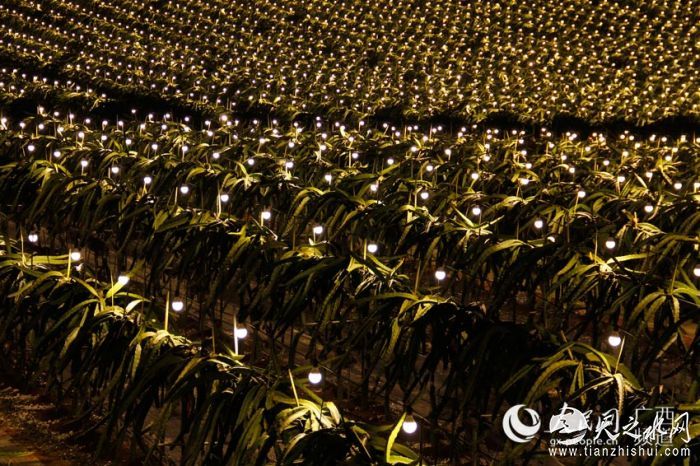 据火龙果种植基地负责人、崇左彩港农业有限公司彬桥厂厂长冼剑锋介绍,给火龙果“亮灯”是为了能够在秋冬时节补上日照时间,促进火龙果的光合作用,增加出果批次。