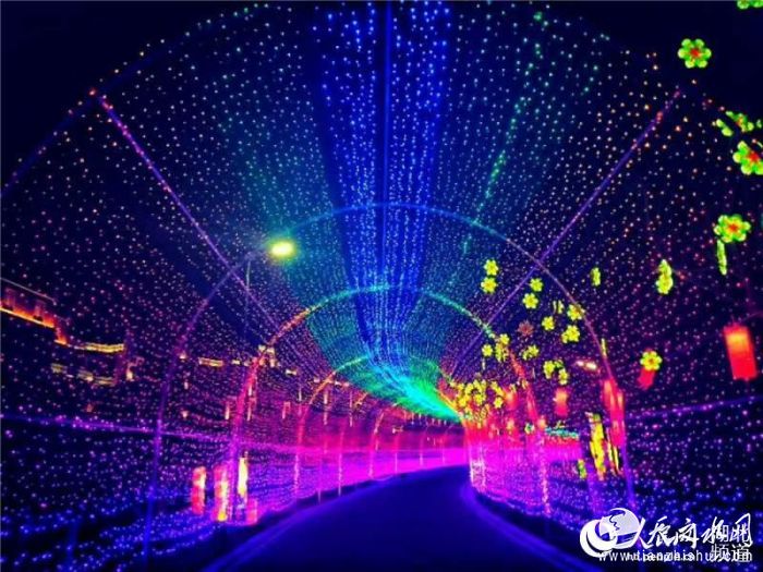 笔者在长沙园门前看到,一座百米长用红、黄、蓝、绿等各色LED灯泡搭建的拱形长廊,宛如星光密织,璀璨夺目。据介绍,这座名为“时空隧道”的扎景,仿照日本桑名市长岛植物园的“星空景观”而建,利用园区弯道形成穿越星际的感觉。